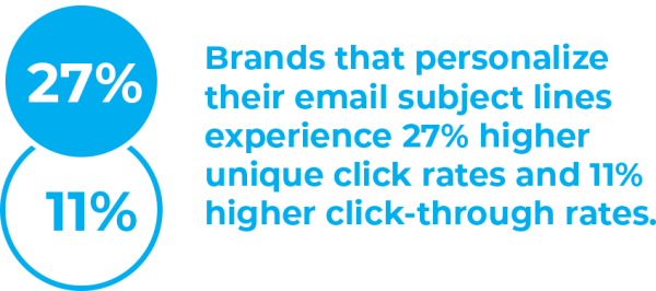 According to Experian, brands that personalize their email subject lines experience 27% higher unique click rates and 11% higher click-to-open rates.